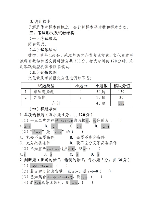 2023年河北省高职单招考试十类 和高职单招对口电子电工类、对口计算机类 文化素质(数学)考试大纲